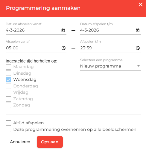 Altijd afspelen: vink dit aan als het programma continu door moet lopen zonder specifieke tijdsrestricties.